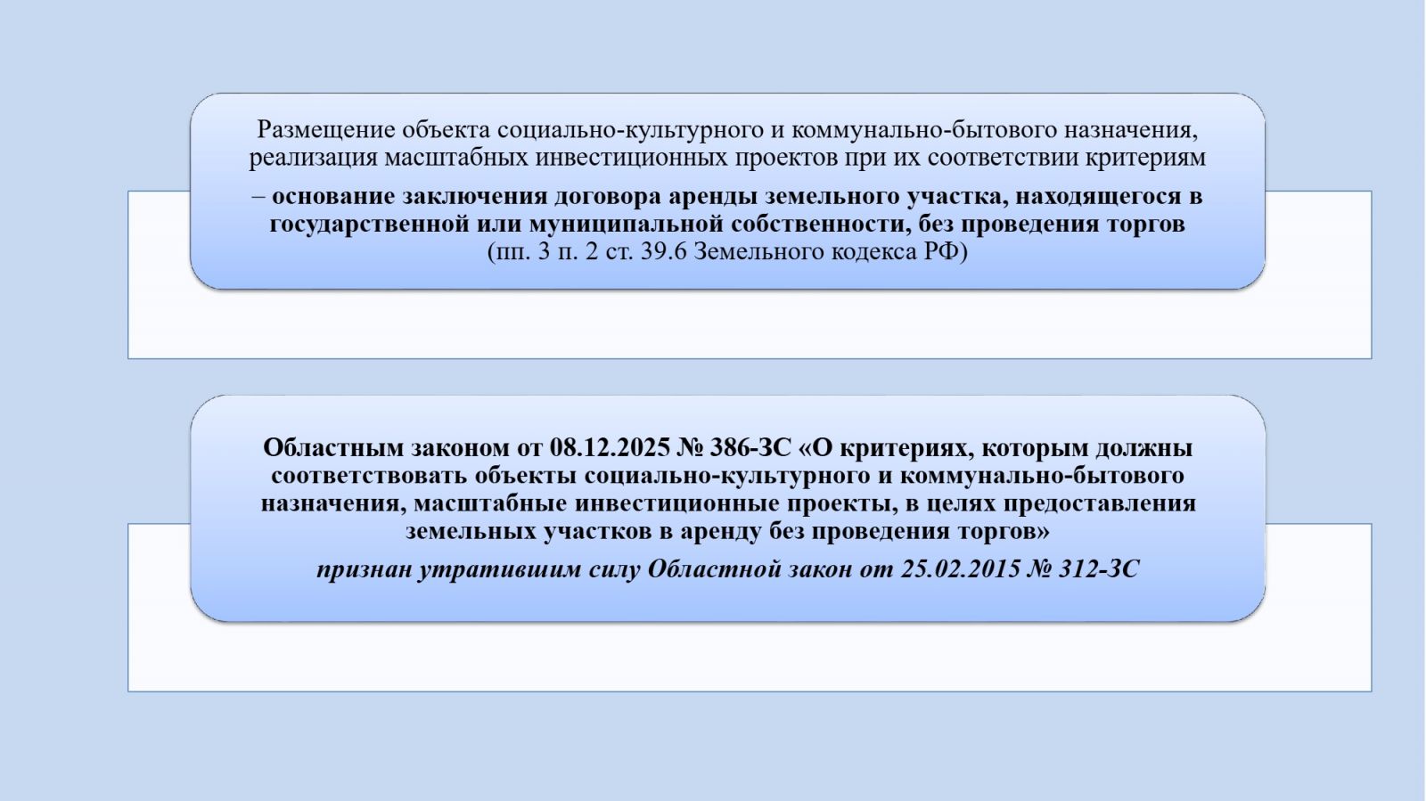 Областной закон от 08.12.2025 № 386-ЗС «О критериях, которым должны соответствовать объекты социально-культурного и коммунально-бытового назначения, масштабные инвестиционные проекты, в целях предоставления земельных участков в аренду без проведения торгов» устанавливает актуальные критерии, которым должны соответствовать объекты социально-культурного и коммунально-бытового назначения, масштабные инвестиционные проекты, в целях предоставления земельных участков в аренду без проведения торгов.